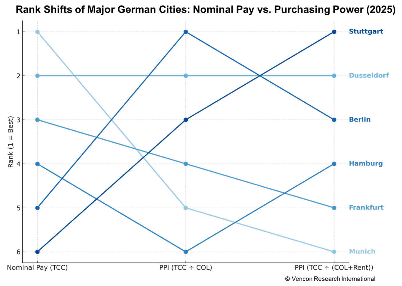 - Munich drops from #1 in nominal pay to last place (#6) once high costs are included.